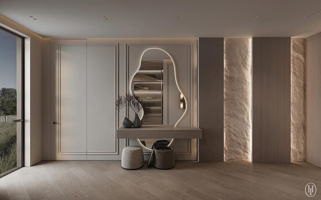 غالبًا تكون نقطة التركيز هي الوجار أو الجدار الرئيسي، ومن هنا يبدأ توزيع بقية العناصر داخل التصميم.